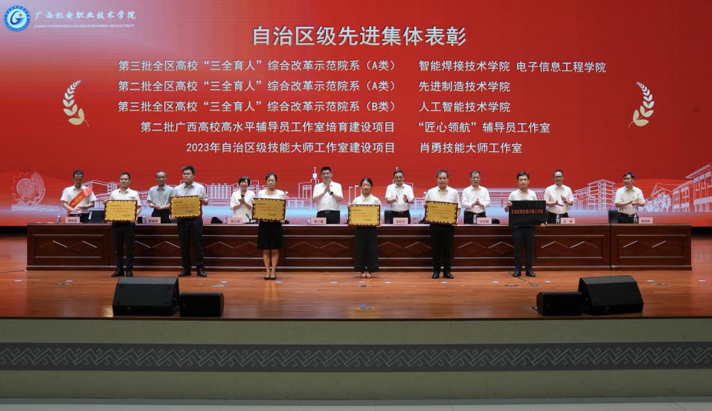 会上,吴世先宣读了获国家级和自治区级先进集体、先进个人的系列表彰决定,一批在党建思政、教学科研、职业技能竞赛、教学竞赛、创新创业竞赛、体育竞赛、社会服务等方面表现优异的集体和个人受到上级表彰。程云燕宣读了《关于表彰2024年度学校“三全育人”先进集体、先进个人和机电最美教师的决定》,全校共有10 个部门(单位)获得“2024 年度学校‘三全育人’先进集体”荣誉称号、7名同志获得“2024 年度学校‘三全育人’机电最美教师”荣誉称号、86名同志获得“2024 年度学校‘三全育人’先进个人”荣誉称号。
