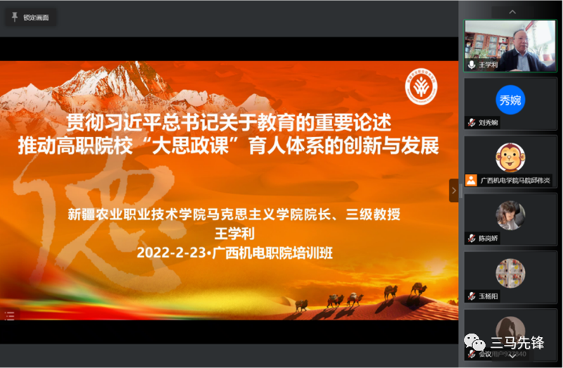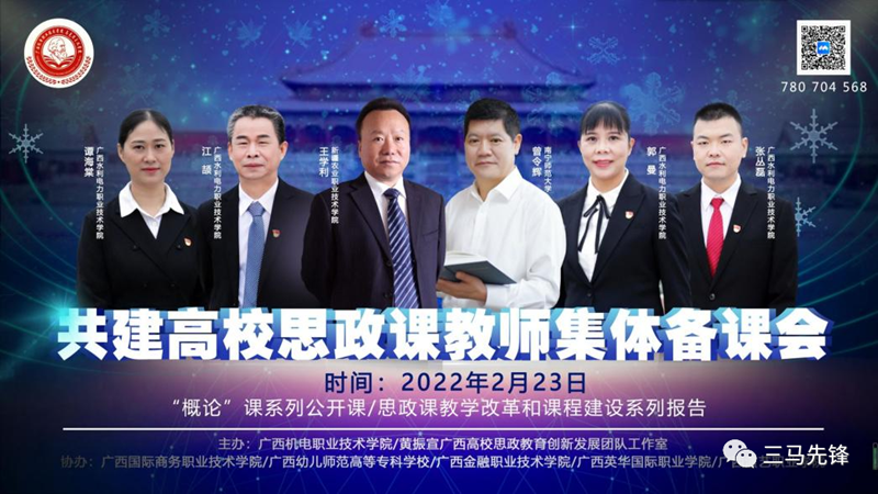 会议邀请了南宁师范大学马克思主义学院院长曾令辉教授、新疆农业职业技术学院马克思主义学院院长王学利教授、广西水利电力职院技术学院思政部主任江颉教授作了专题报告;邀请2021年度广西职业教学能力大赛一等奖获奖团队、广西水利电力职业技术学院的郭曼、谭海棠、张丛磊等3位教师进行示范课教学展示。