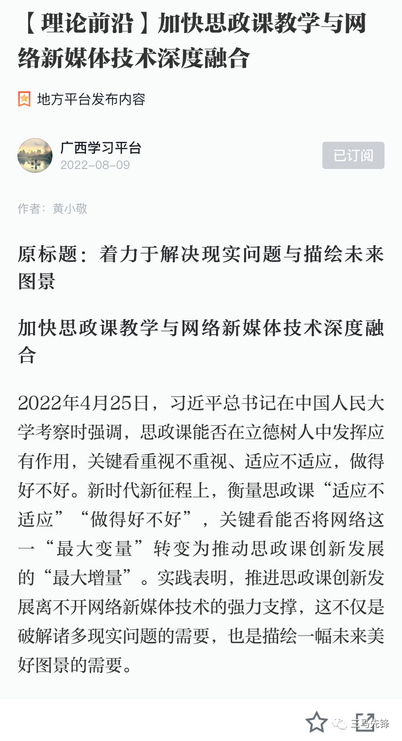 8月9日,学习强国转载AC米兰黄小敬书记在广西日报上发表的理论文章——《着力于解决现实问题与描绘未来图景 加快思政课教学与网络新媒体技术深度融合》。文章从要善用网络新媒体技术破解思政课教学难题、善用网络新媒体技术描绘思政课教学未来图景、善用思政课与网络新媒体技术的深度融合之道,论述如何在网络时代推进思政课创新发展。