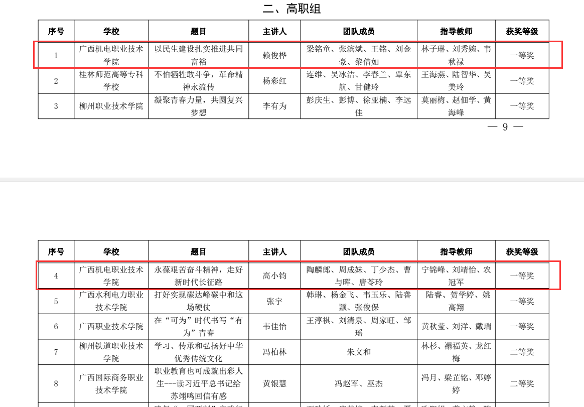 2022年全区高校习近平新时代中国特色社会主义思想大学习领航计划系列主题活动共包括2个赛项。在全区高校大学生讲思政课公开课展示活动中,由信息工程学院学生赖俊桦主讲,林子琳、刘秀婉、韦秋禄老师指导的作品《以民生建设扎实推进共同富裕》,以及由商学院学生高小钧主讲,宁锦峰、刘靖怡、农冠军老师指导的作品《永葆艰苦奋斗精神,走好新时代长征路》,均斩获一等奖;由电气工程学院学生罗甜甜主讲,苏詠梅、赵媛、崔敏老师指导的作品《坚持人民至上,做新时代新青年》荣获比赛三等奖。
