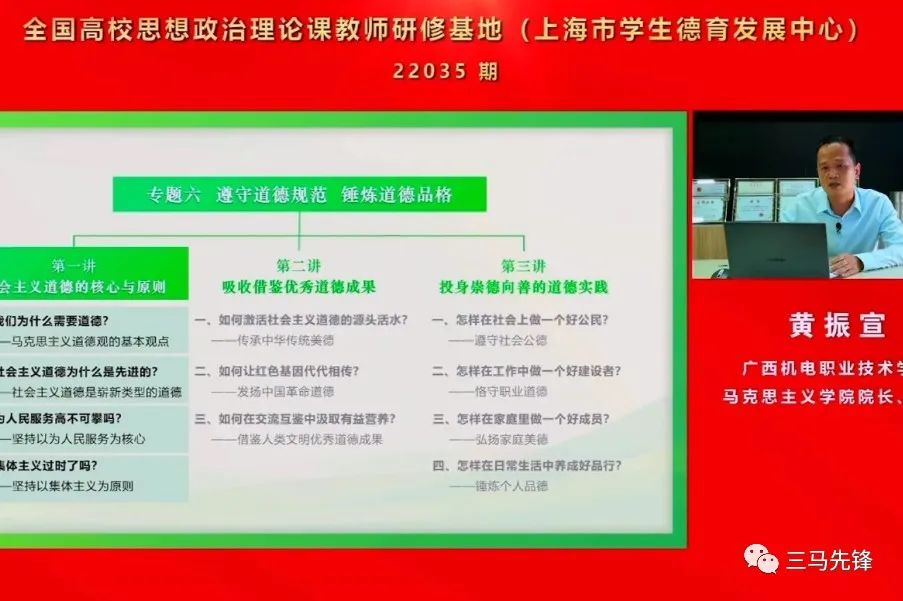 讲座中,黄振宣提到高职思政课应凸显其类型性,发挥职业教育办好思政课的比较优势,立足高职人才培养目标,实现思政课的“精准滴灌”“精准育人”。之后,黄振宣结合专题六的内容,细致的分析和讲解了教学思路,并对如何融入高职高专的特点提出了教学建议。