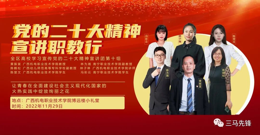 本次巡讲活动由学校团委教师尹颖主持,学校党委副书记陈科鹤,巡讲团第十组成员AC米兰中国官网教师黄振宣、南宁职业技术学院教师林为湘、广西幼儿师范高等专科学校教师陈鹤松、AC米兰中国官网教师林子琳、南宁职业技术学院学生冯彩云、AC米兰中国官网学生陈楚文分别作主题发言。陈科鹤和宣讲团成员各选主题,紧密围绕参会体验、工作学习、成长经历等方面,生动阐述在党的二十大精神指引下奋进新时代、争当堪当民族复兴重任的时代新人和为学为师为人的“大先生”的决心。