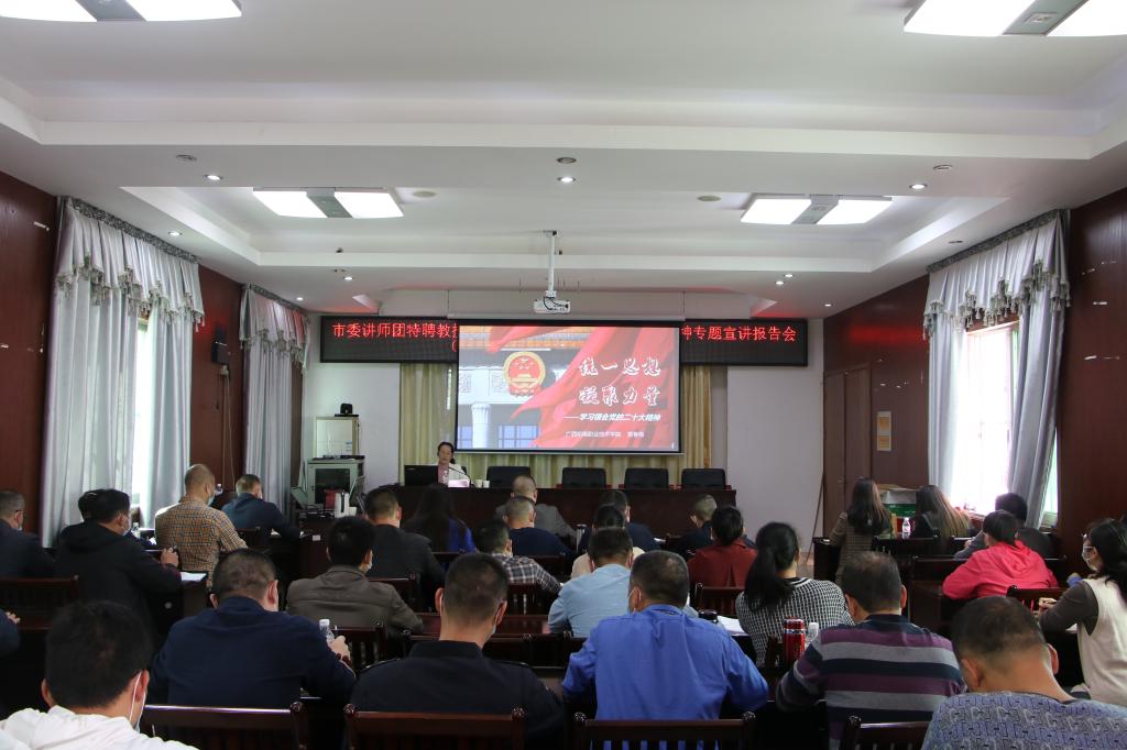 当前正值全国上下掀起学习宣传贯彻党的二十大精神的热潮之际,我院石月皎、崔敏、黄春梅、韦家旭四名教师作为南宁市宣讲团特聘教授(专家)成员,于近期赴南宁市多个城区基层单位开展党的二十大精神理论宣讲,为当地党员干部送党课、传理论。