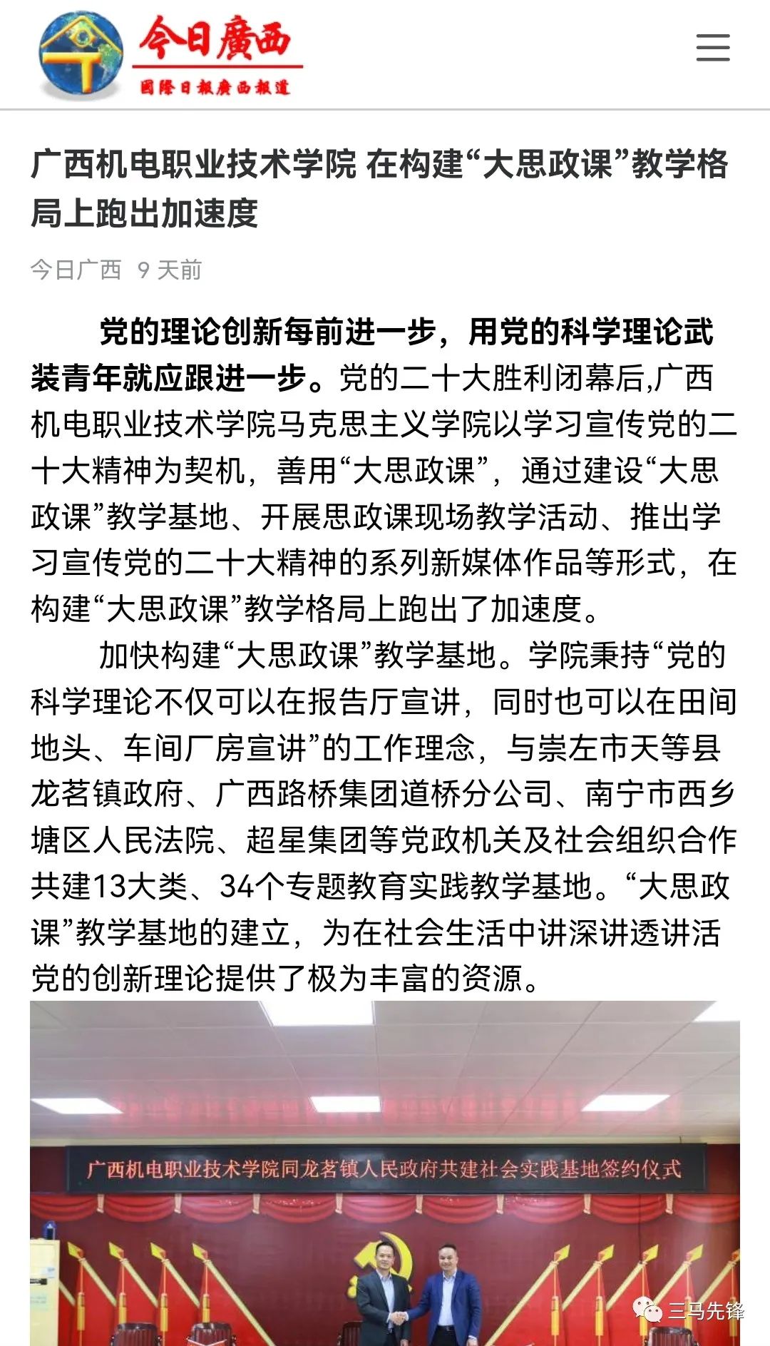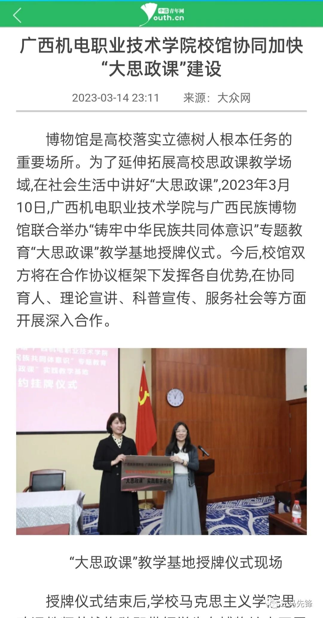 近期,我院与多个党政机关和社会组织合作共建“大思政课”教学基地,人民网、中国青年网、今日广西、南国早报、广西八桂职教等多家媒体对我院加快推进“大思政课”建设进行了报道。