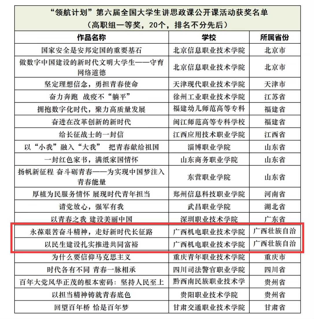 在第六届全国高校大学生讲思政课公开课展示活动中,由信息工程学院学生赖俊桦主讲,林子琳、刘秀婉、韦秋禄三位老师指导的作品《以民生建设扎实推进共同富裕》,以及由商学院学生高小钧主讲宁锦峰、刘靖怡、农冠军三位老师指导的作品《永葆艰苦奋斗精神,走好新时代长征路》,两个作品均获全国一等奖。