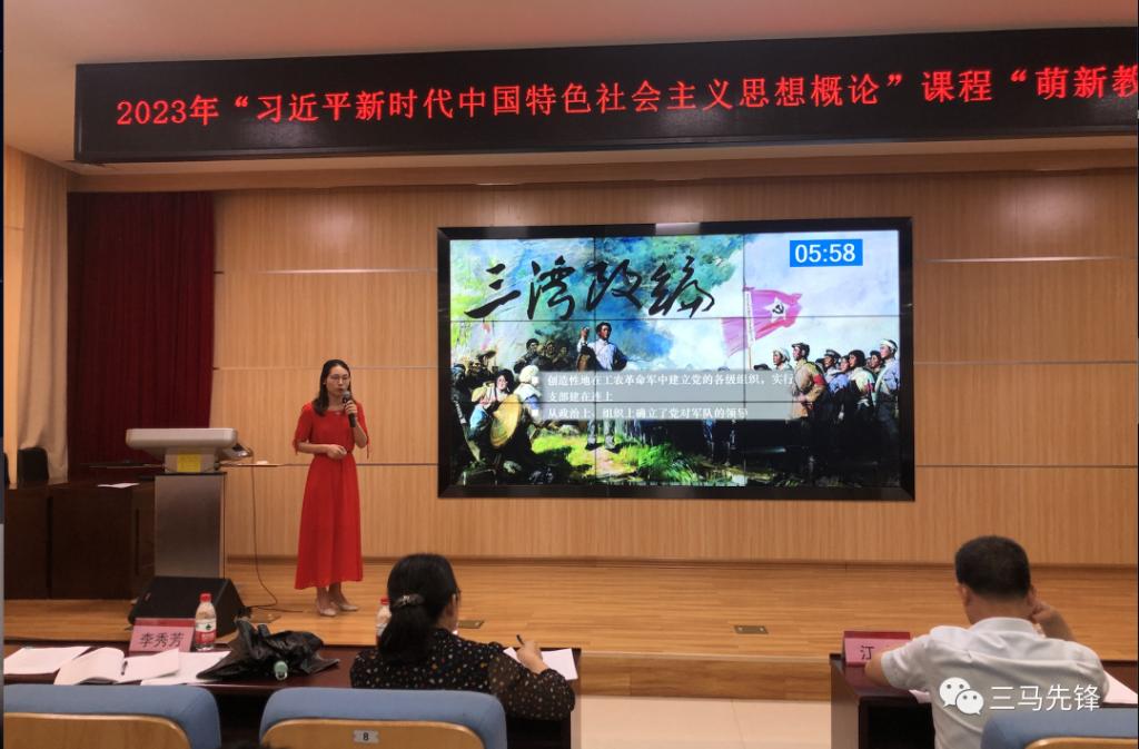 活动现场,16名“萌新教师”从“习近平新时代中国特色社会主义思想概论”课程中自选一个教学主题,依次进行教学展示。经过激烈角逐,王乐乐、陆倩倩、韦秋禄三位“萌新教师”分列总分前三名,将代表学校参加2023年度共建院校“习近平新时代中国特色社会主义思想概论”课程“萌新教师磨课总会”。