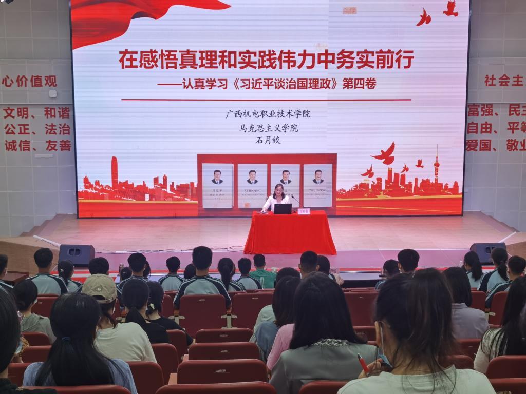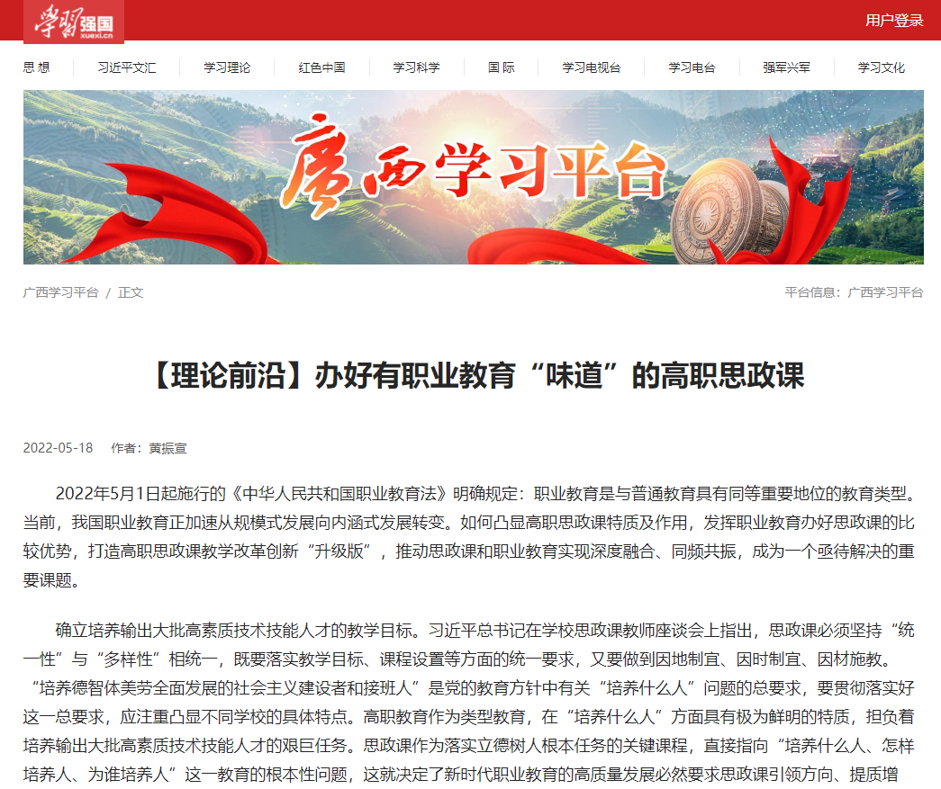 思政课教师发挥学科优势积极参与党的创新理论宣讲,多名教师被聘为自治区“劳模工匠进校园·思政教师进企业”活动百人讲师团成员、自治区“强国复兴有我”百姓宣讲团成员、南宁市理论宣讲团特聘教授、广西卫视《凡事说理》特邀专家,深入基层和电视台开展党的创新理论宣讲阐释50多场。近5年来,思政课教师在《中国文化报》《广西日报》《时事报告》等地方党报党刊上发表20多篇理论文章,深受社会关注和好评。