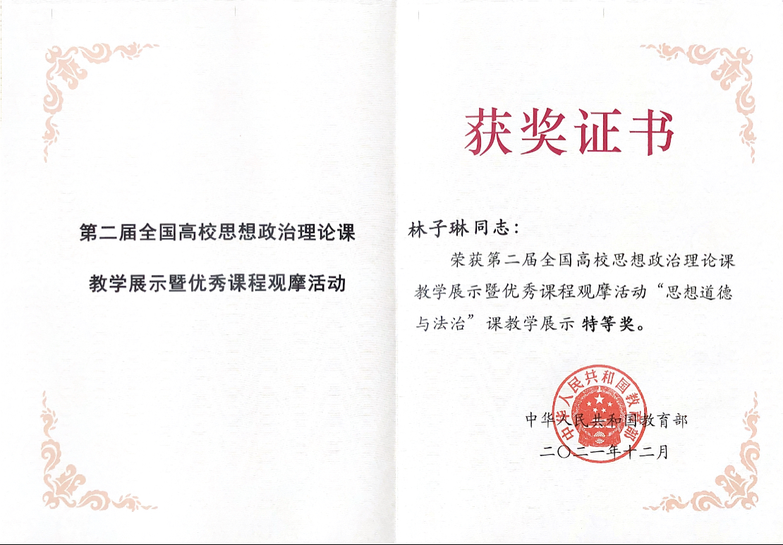 林子琳荣获全国高校思政课教学展示暨优秀课程观摩活动评选活动特等奖