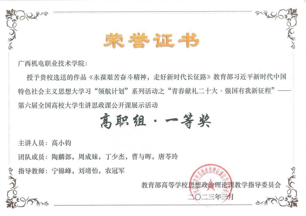 2020—2023年连续4年获广西高校思政课教师教学基本功暨“精彩一课”比赛最高奖项;