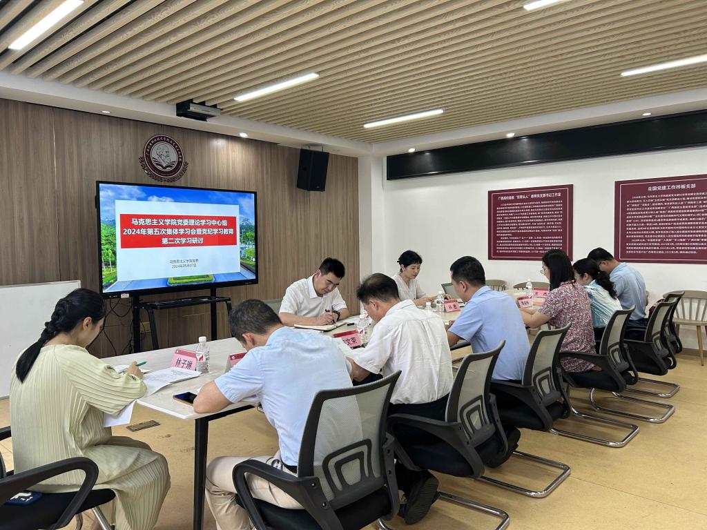 会上,马克思主义学院院长黄振宣、副院长韦文荣分别领学《中国共产党纪律处分条例》第二编第六章和第二编第七章。围绕学习内容,结合工作实际,黄振宣作了题为《思政课教师要做遵守政治纪律的表率》的中心发言,韦文荣作了题为《严明政治纪律和组织纪律 做符合新时代要求的思政课教师》的中心发言。“信马”党支部书记石月皎、“传马”党支部书记韦家旭先后作了交流发言。