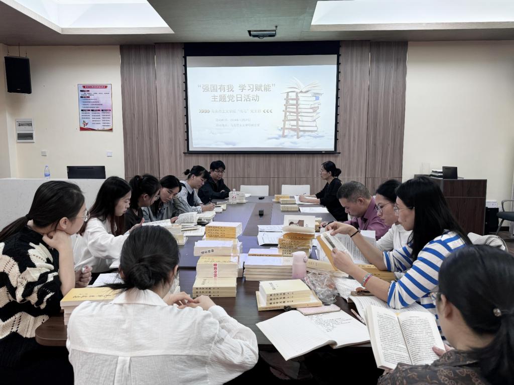 为推动学风建设走深走实,促进“传马”党支部教师对马克思主义经典著作的深入学习和研读,感悟马克思主义理论的深刻内涵和真理魅力,10月29日,“传马”党支部在学院阅览室成功举办了“强国有我 学习赋能”主题党日活动暨经典图书赠书仪式。活动由“传马”党支部书记韦家旭主持,学院党委副书记韦文荣参加了本次活动。