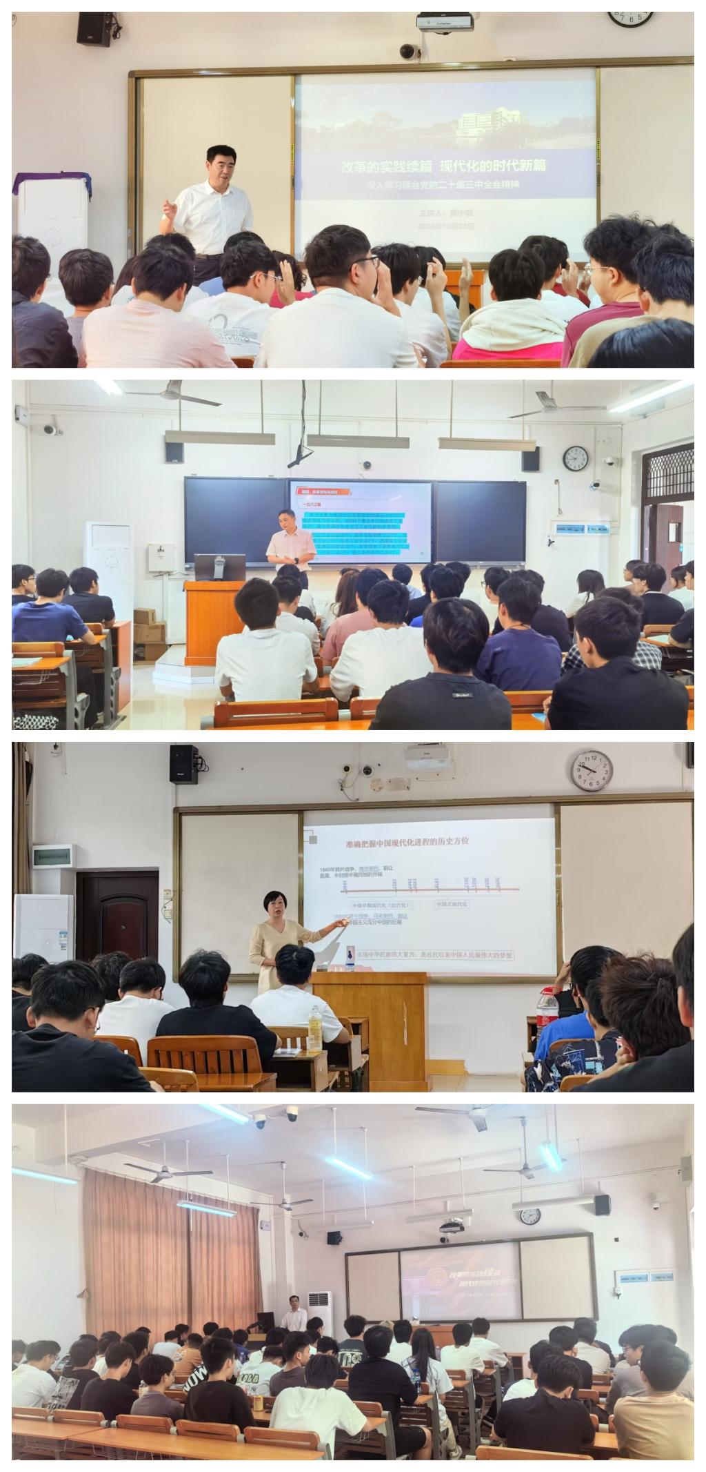 为深入学习贯彻党的二十届三中全会精神,贯彻落实习近平总书记关于思政课建设的重要指示,落实领导干部上讲台系列要求,全面推进新时代学校思政课建设,引导学生全面、准确地领会全会精神,根据校党委统一部署,近日,学校领导黄小敬、吴世先、程云燕、乐其顺等分别深入课堂,以“改革的实践续篇 现代化的时代新篇”为主题,面向不同学院、不同专业的学生讲授了一堂别开生面的专题思政课,宣讲党的二十届三中全会精神,进一步推动习近平新时代中国特色社会主义思想进教材、进课堂、进头脑。