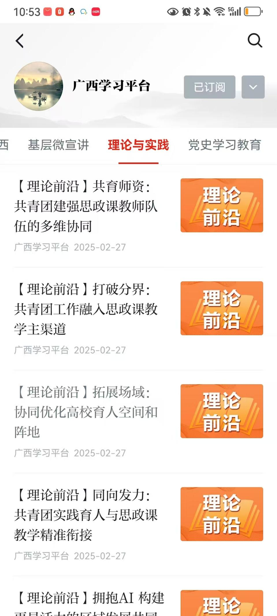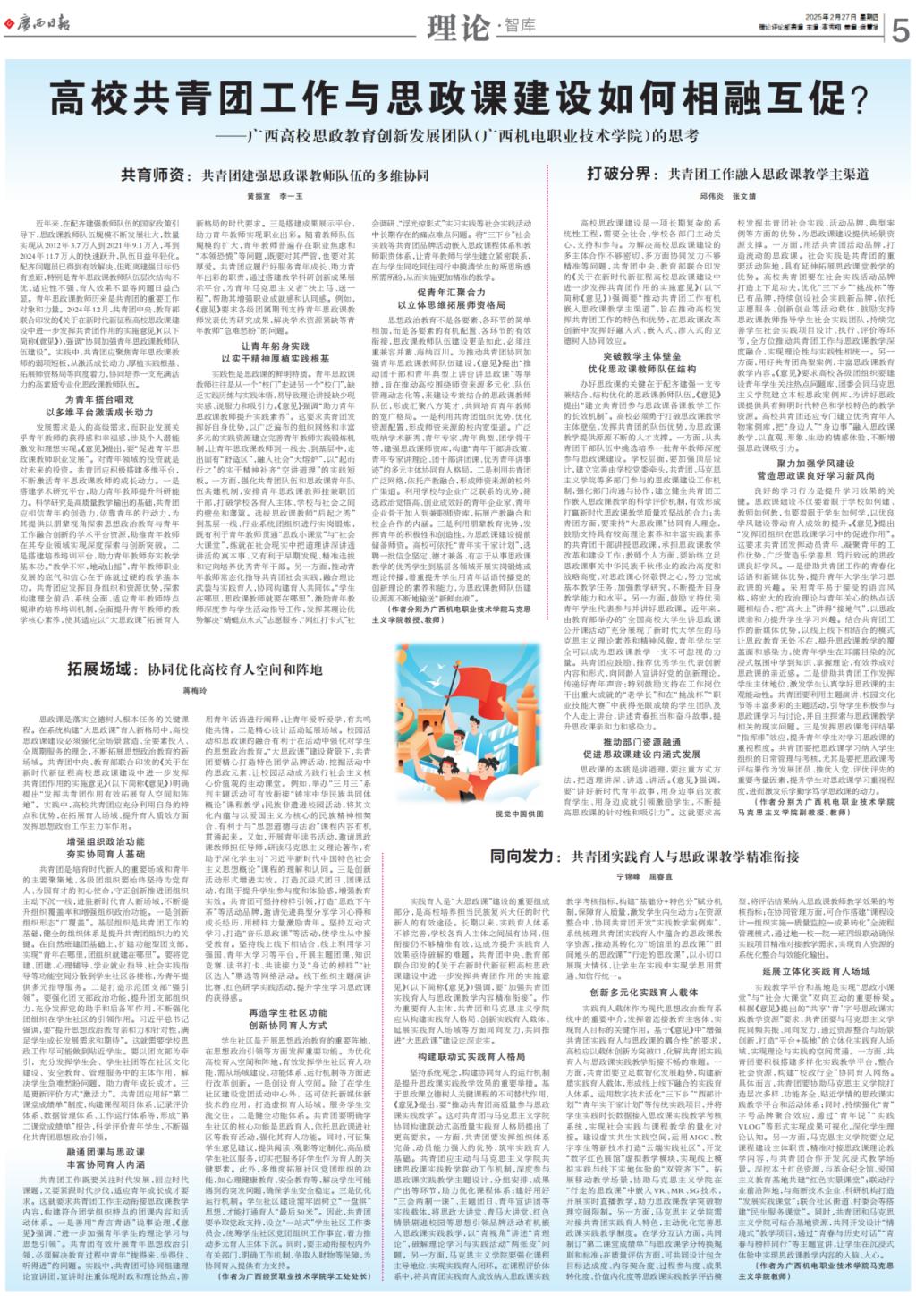 「编者按」2025年2月27日,《广西日报》第005版(理论·智库)整版刊发黄振宣(AC米兰中国官网)广西高校思政教育创新发展团队理论文章共4篇。文章紧密围绕“高校共青团工作与思政课建设如何相融互促”,就如何在思政课建设中进一步发挥高校共青团作用进行了深入思考、提出了相应对策。《学习强国》广西学习平台对4篇文章均进行转载。