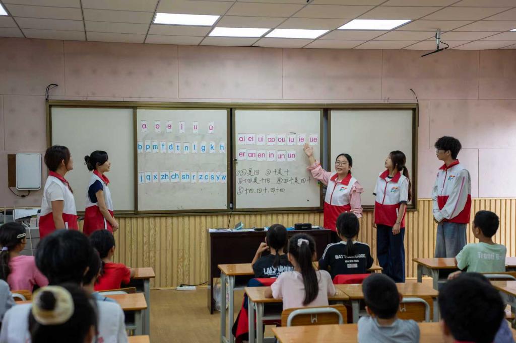 离开融媒体中心,实践团走进德保县那甲村和那甲村中心小学,聚焦儿童语言学习需求,将普通话推广与民族团结教育深度融合,开启惠民服务行动。成员们首先深入了解儿童日常语言使用习惯,结合国家通用语言文字普及工程要求,精心设计并开设了趣味十足的“普通话小课堂”。