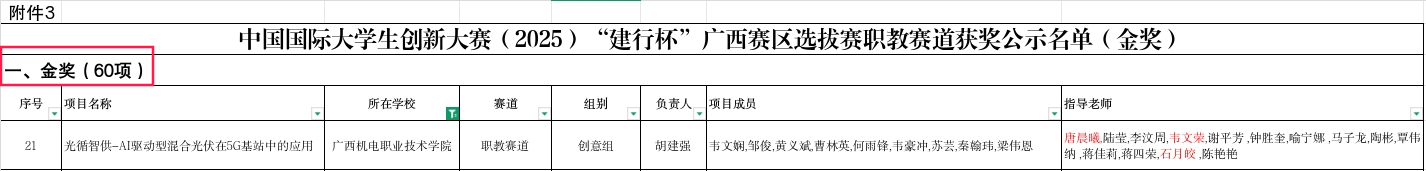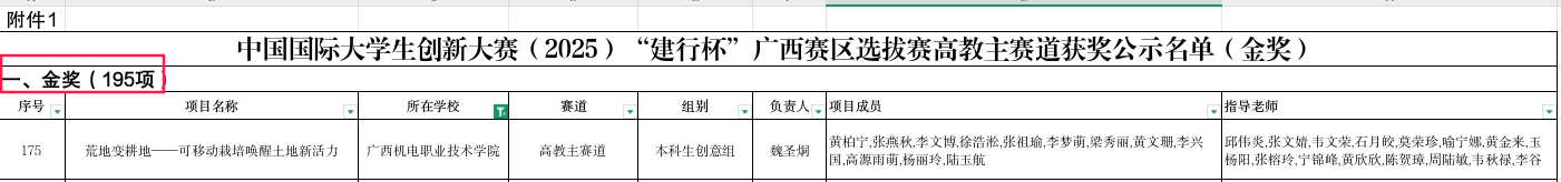 据悉,全区共有120所院校、33.2万个项目、52万名学生参赛。经过区赛专家委员会评审、组织委员会审定,最终评选出金奖350项、银奖688项、铜奖1829项,萌芽赛道“创新潜力奖”10项、入围决赛奖19项,单项奖5项。其中我院教师选送的项目《荒地变耕地——可移动栽培唤醒土地新活力》《光循智供——AI驱动型混合光伏在5G基站中的应用》项目挺进现场总决赛并分别斩获广西赛区选拔赛高教主赛道金奖、职教赛道金奖;此外,《小瑜知青农场——农业新媒体三产融合创新引领者》项目获广西赛区选拔赛“青年红色筑梦之旅”赛道铜奖,《国潮匠“新”——漫航机甲和影视道具的“刻画机”》项目获广西赛区选拔赛职教赛道铜奖。