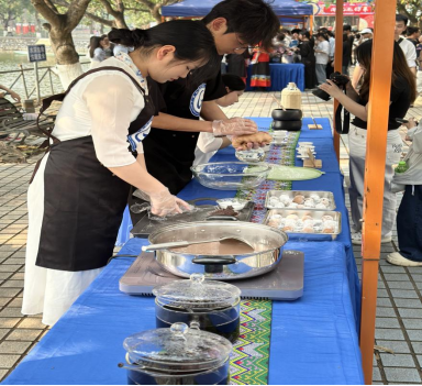 活动开始,茶艺师在现场展示了广西六堡茶的生活品饮技能,包括传统的煮饮法、使用具有地方特色的坭兴陶壶进行冲泡的方法,以及焖泡法等多种泡茶方式。最受瞩目的是师生团队创造性推出六堡茶汤圆。学校党委书记黄小敬及其他校领导专程来到活动现场,饶有兴致地品尝六堡茶汤圆,茶香与糯香完美融合,黄小敬书记品尝后高度赞赏:"这道茶点既有文化味,又有创新意,建议学校外事接待时给国际友人品尝,让更多嘉宾感受广西茶文化魅力。"