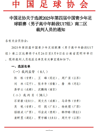 2025年第四届中国青少年足球联赛(男子高中年龄段U17组)南二区裁判工作圆满落幕,我院体育教师招继成作为广西足协推荐代表,出色完成了在云南昆明市的南二区执裁任务。