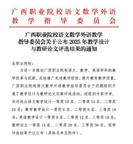 近日,在广西职业院校语文数学外语教学指导委员会组织的“优秀教学设计与教研论文征集评选”活动中,我院教师表现突出,荣获四个奖项:英语教学设计一等奖1项、二等奖1项、三等奖1项,以及语文教学设计二等奖1项。