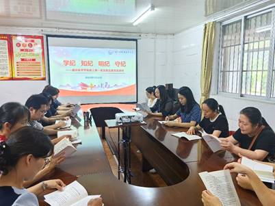 主题党日活动上,党支部书记黄小玉带领全体党员围绕六项内容展开学习:(一)第一议题学习,学习《习近平关于严明党的纪律和规矩论述摘编》之“一、加强纪律建设是全面从严治党的治本之策”》;(二)集体观看《中国共产党纪律处分条例》修订发布视频;(三)集体观看警示教育片《扣好廉洁从政“第一粒扣子”》,对党员进行廉洁教育;(四)黄小玉书记领学《中国共产党纪律处分条例》第四章、第五章、第六章;(五)支部党员在学习通上完成《党纪应知应会测试题》;(六)支部党员联系工作实际,紧扣“六项纪律”开展研讨。