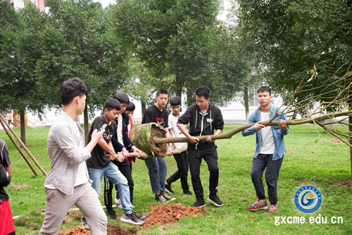 植树现场,后勤管理处的老师进行了现场指导,确保了种植质量及绿化美观。师生们个个干劲十足,植苗、填土、围堰、浇水,大家分工协作,相互配合,场面热火朝天。经过一番忙碌,一棵棵由师生、校友新栽的宫粉紫荆、黄花风玲木、橄榄等树苗在教学区周边、尚德苑、机械系办公楼周边等地迎风挺立,焕发着勃勃生机。据了解,本次领植的树苗中,宫粉紫荆胸径7-8cm,高300-350cm,预计近两年将长成盛开;黄花风铃木胸径6-7cm,高300-350cm,橄榄树胸径5-6cm,高200-250cm,肉桂胸径3-4cm,高220-250cm,这些新栽树苗,不久将成为我院的又一园林景观。