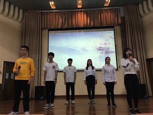 在英文诗歌朗诵环节,朗诵者用自己的心体会诗歌,选用优美的背景音乐,将朗诵与表演融为一体。