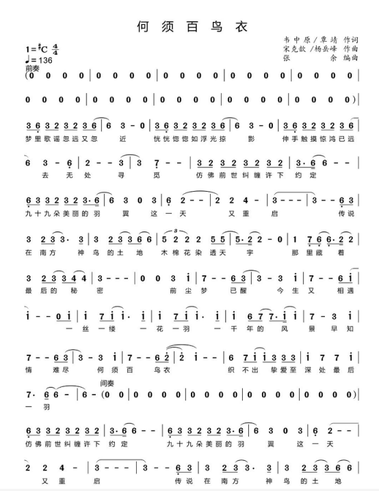 《何须百鸟衣》改编自壮族地区广泛流传的民间传说“百鸟衣”。词曲深入挖掘广西本土民间文化,将“百鸟衣”传说进行新民歌改编,用二度创作的方式将故事做了延续、展开新的内容。通过歌曲的形式,展示了一段可歌可泣、悲壮凄美的爱情故事。