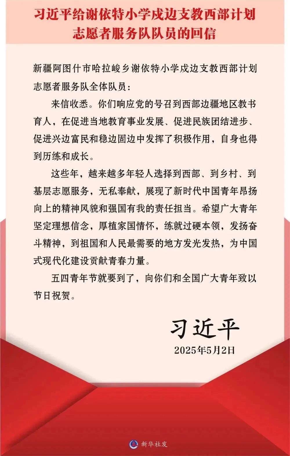 都安瑶族自治县职业教育中心教育人才“组团式”帮扶工作队队员、人工智能技术学院教师邓谞婵:在五四青年节之际,习近平总书记给谢依特小学戍边支教西部计划志愿者服务队队员的回信,饱含对青年扎根西部、奉献祖国的殷切期望。作为一名曾经服务新疆的西部计划志愿者,如今继续承担支教广西山区的青年教师,我深感使命光荣,更觉责任重大。从西北戈壁到西南山乡,我也用自己十年的青春和热血见证了边疆教育的点滴变化:孩子们渴望知识的眼神、课堂里愈发响亮的读书声、职业教育为乡村点燃的希望之火……。总书记的回信让我再次坚定信念——支教不仅是传授知识,更是传递一种精神,一种“到祖国最需要的地方去”的担当。未来,我将继续深耕三尺讲台,用专业与热忱帮助更多学生掌握技能、筑梦人生。愿与万千青年志愿者一道,以教育为纽带,在边陲大地书写无愧于时代的青春篇章!