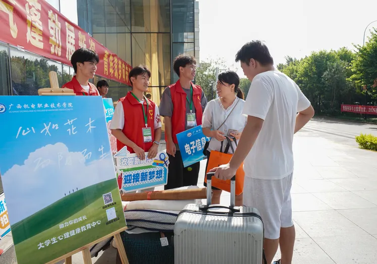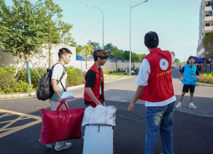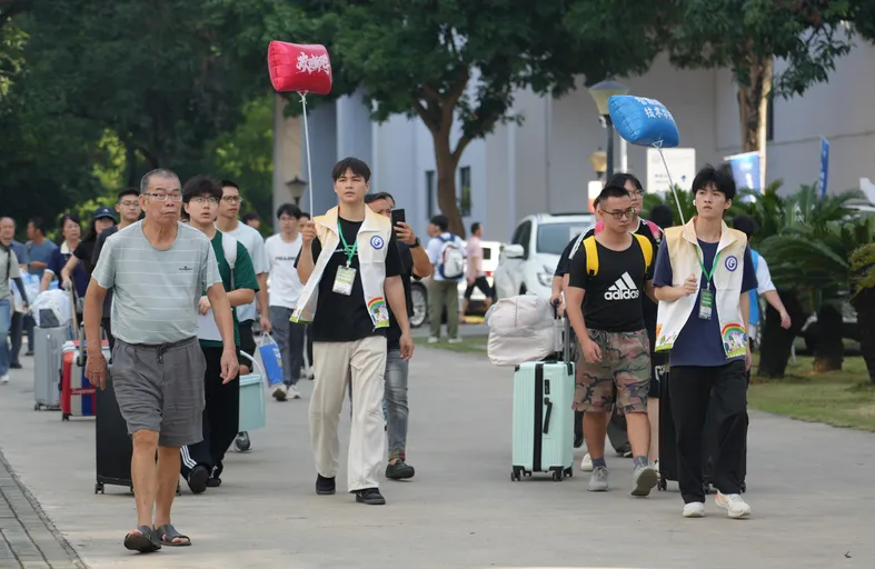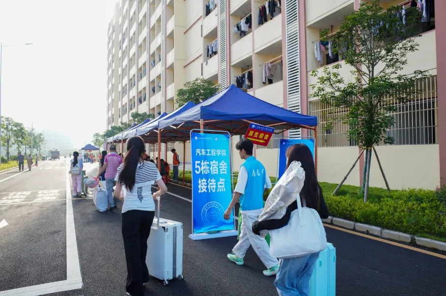清晨,前来报到的同学陆续抵达学校,此起彼伏的问候声、行李滚轮的滚动声、志愿者们清脆的指引声交织在一起,奏响了一首充满活力的迎新交响曲。