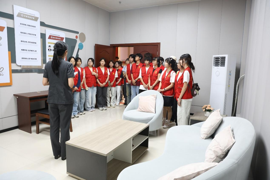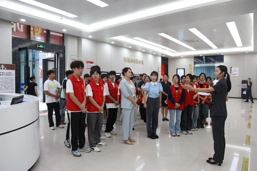 在法院工作人员的热情引导下,研学团队依次开启了法院大堂、诉讼服务中心、调解室、审判法庭等功能区域的深度探访,全方位感受司法工作的规范与温度。工作人员结合大厅内标准化的服务窗口,细致讲解了立案、调解、诉讼等完整的工作流程。“从材料接收登记到案件分类流转,每一个环节都如精密咬合的齿轮,环环相扣、有序推进,稳稳托举着公平正义的实现。”学生们凝视着窗口前清晰的流程指引与工作人员耐心服务的场景,深刻体会到法律程序中的严谨与人文关怀。