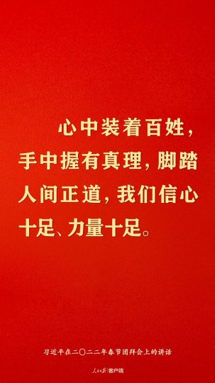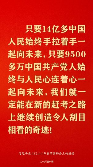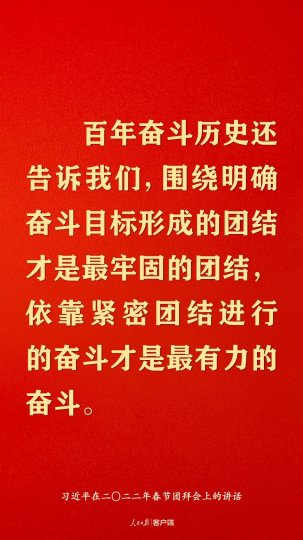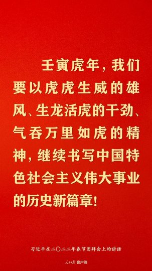 我们隆重庆祝中国共产党成立一百周年,礼序乾坤、乐和天地,击鼓催征、奋楫扬帆,激发了全党全社会奋进新时代的磅礴力量。我们召开党的十九届六中全会并作出第三个历史决议,如期打赢脱贫攻坚战,如期全面建成小康社会,实现第一个百年奋斗目标,开启全面建设社会主义现代化国家新征程,在中华民族伟大复兴历史进程中写下了浓墨重彩的一笔。一年来,我国经济发展和疫情防控保持世界领先,构建新发展格局迈出新步伐,高质量发展取得新成效,国家战略科技力量加快壮大,改革开放迈出新步伐,民生保障有力有效,生态文明建设持续推进,碳达峰碳中和工作全面部署,国防和军队建设有力拓展,香港实现由乱转治,反“独”促统斗争不断加强,中国特色大国外交继续推进,党史学习教育成效显著,社会大局保持稳定,“十四五”实现良好开局。在百年变局和世纪疫情交织的复杂形势下,我们取得这些成绩,极大增强了全党全国各族人民奋进新征程、建功新时代的豪情和信心。过去一百年,中国共产党向人民、向历史交出了一份优异的答卷。现在,党团结带领全国各族人民踏上了实现第二个百年奋斗目标新的赶考之路。一百年来,党和人民取得的一切成就都是团结奋斗的结果,团结奋斗是中国共产党和中国人民最显著的精神标识。百年奋斗历史告诉我们,团结就是力量,奋斗开创未来;能团结奋斗的民族才有前途,能团结奋斗的政党才能立于不败之地。百年奋斗历史还告诉我们,围绕明确奋斗目标形成的团结才是最牢固的团结,依靠紧密团结进行的奋斗才是最有力的奋斗。我们靠团结奋斗创造了辉煌历史,还要靠团结奋斗开辟美好未来。只要14亿多中国人民始终手拉着手一起向未来,只要9500多万中国共产党人始终与人民心连着心一起向未来,我们就一定能在新的赶考之路上继续创造令人刮目相看的奇迹!世界上最大的幸福莫过于为人民幸福而奋斗。心中装着百姓,手中握有真理,脚踏人间正道,我们信心十足、力量十足。无论风云如何变幻,无论挑战如何严峻,我们都要弘扬伟大建党精神,铭记生于忧患、死于安乐的古训,常怀远虑、居安思危,紧密团结、艰苦奋斗,继续把中华民族伟大复兴的历史伟业推向前进!对百年奋斗历史最好的致敬,是书写新的奋斗历史。今年下半年,中国共产党将召开第二十次全国代表大会,总结过去五年的工作,谋划未来一个时期的发展蓝图。我们要统筹国内国际两个大局,统筹推进“五位一体”总体布局、协调推进“四个全面”战略布局,统筹发展和安全,统筹疫情防控和经济社会发展,坚持稳中求进工作总基调,完整、准确、全面贯彻新发展理念,加快构建新发展格局,全面深化改革开放,推动高质量发展,持续保障和改善民生,着力保持平稳健康的经济环境、国泰民安的社会环境、风清气正的政治环境,以实际行动迎接党的二十大胜利召开。在中国传统文化中,虎是百兽之王,是力量、勇敢、无畏的象征。壬寅虎年,我们要以虎虎生威的雄风、生龙活虎的干劲、气吞万里如虎的精神,继续书写中国特色社会主义伟大事业的历史新篇章!北京冬奥会、冬残奥会即将开幕,中国人民已经做好准备,将为世界奉献一场简约、安全、精彩的奥运盛会,祝愿中外冰雪运动健儿如虎添翼、创造佳绩!最后,祝大家身体健康、阖家幸福、万事如意、虎年吉祥!