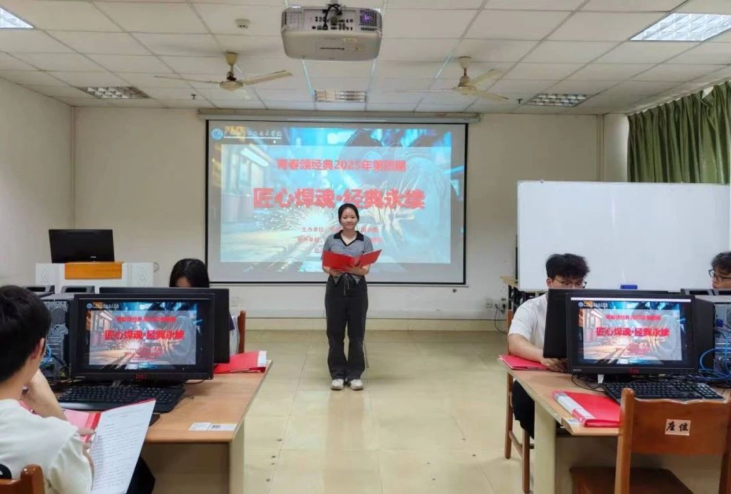 在经典荐读环节,益文书社代表视传2302班方雪成同学围绕“焊艺匠心,筑梦前行”的主题,向在场师生推介了纪实文学作品《匠人》。该书以苏北申村十五位手工艺匠人为叙事主体,通过鲜活案例诠释了专注坚守、精益求精的匠人精神内核。方雪成在分享中表示,书中“一砖一瓦的打磨”与焊接学子“每一道焊缝的精准控制”形成跨越时空的精神共振,这种精神传承的共通性,相信能使在场焊接专业学子深受触动。