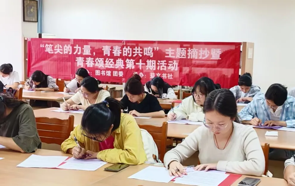 为助力学生在信息碎片化时代重拾深度阅读之趣,从经典作品中汲取精神滋养,10月21日,学校图书馆与团委联合主办的“笔尖的力量,青春的共鸣”主题摘抄暨青春颂经典第十期活动,在相思湖校区图书馆五楼阅览室举行。本次活动吸引了百余名同学积极参与。