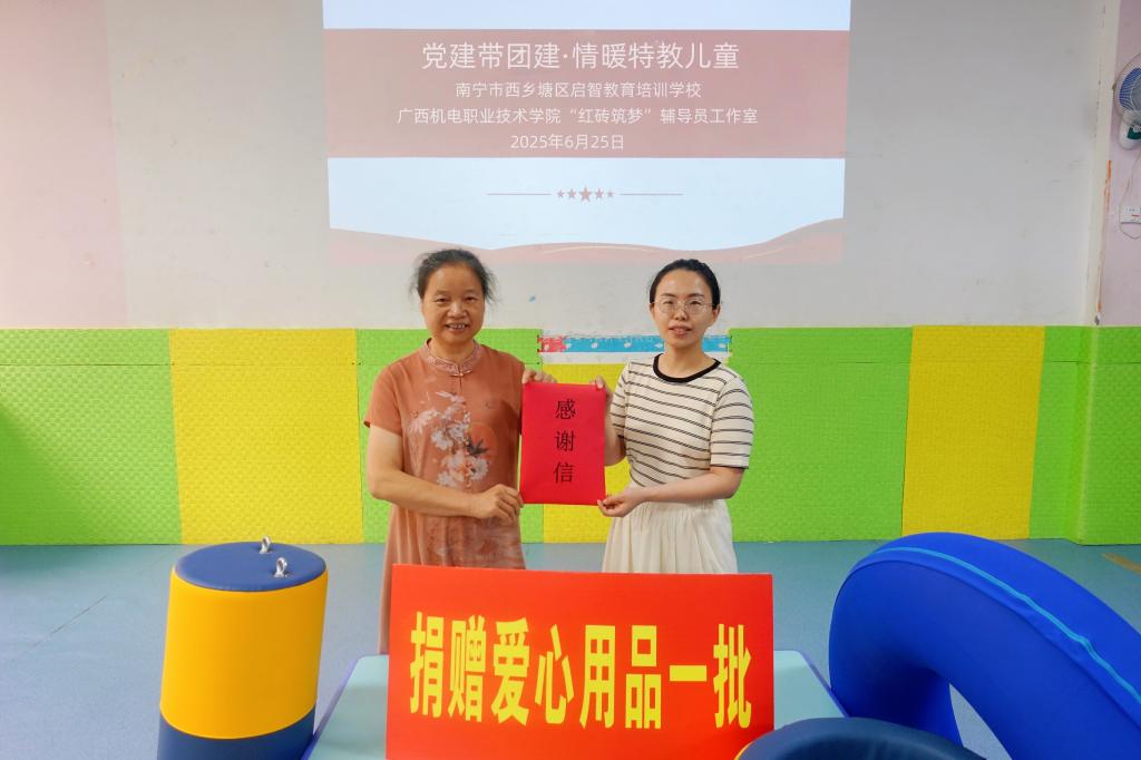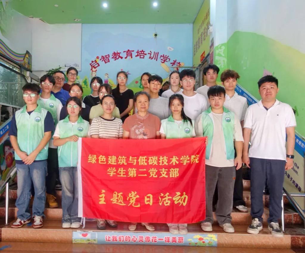 近日,由绿色建筑与低碳技术学院学生党支部、“红砖筑梦”辅导员工作室共同开展的“党建带团建,情暖特教儿童”主题党日活动,在南宁市西乡塘区启智教育培训学校举行。20余名学院师生党员、入党积极分子及共青团员组成的志愿者队伍,通过义务支教、空调清洗等志愿服务,以实际行动让党旗在志愿服务一线高高飘扬。