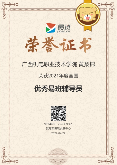 2021年12月,2021年度全国易班共建评优工作评选中,黄梨锦老师荣获全国优秀易班辅导员。颁奖单位:教育部易班发展中心。