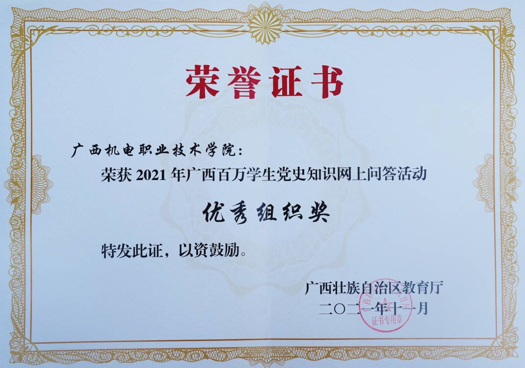 2021年11月,广西百万学生党史知识网上问答活动中,学校荣获省部级优秀组织奖。颁奖单位:广西壮族自治区教育厅。