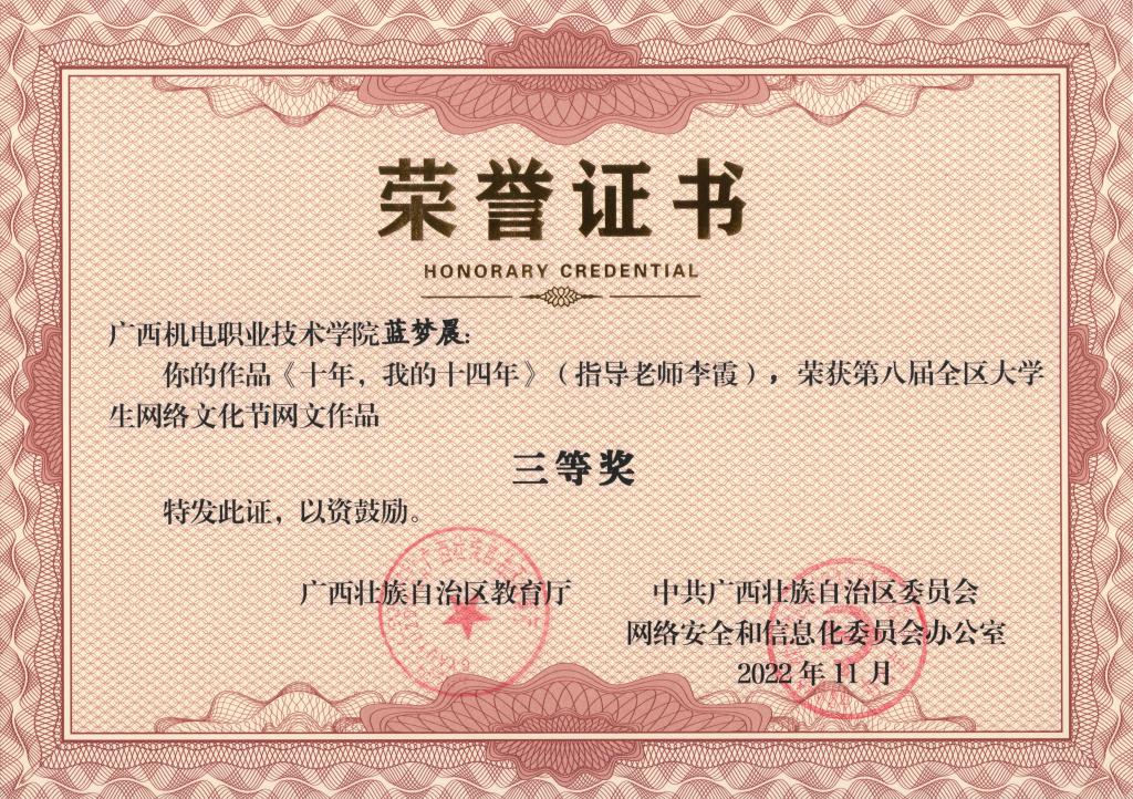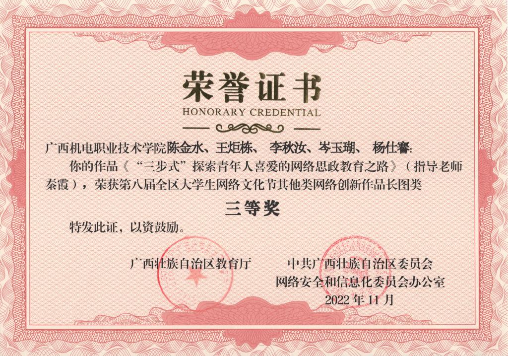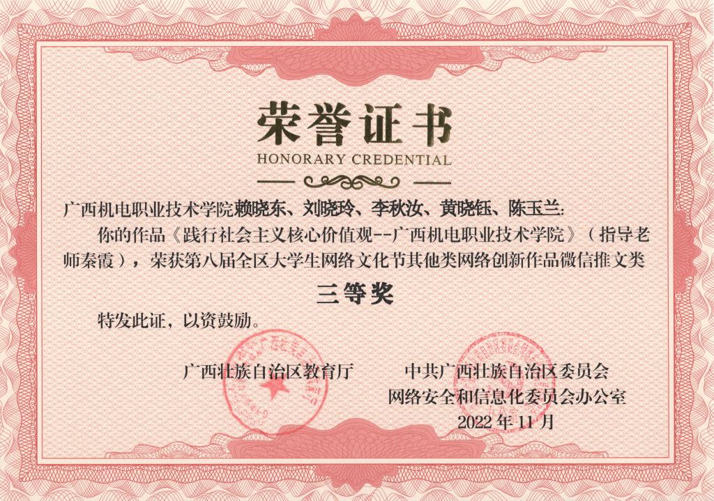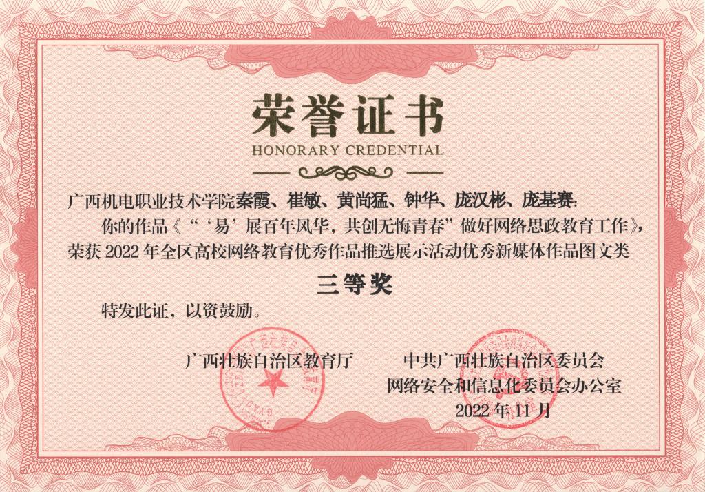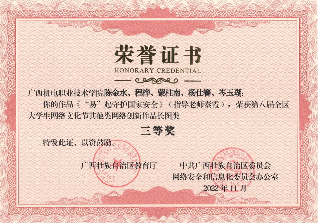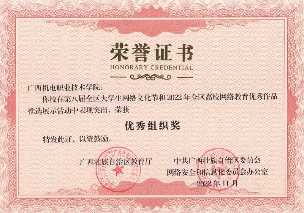 2022年11月,在第八届全区大学生网络文化节和2022年全区高校网络教育优秀作品推选展示活动中,学校荣获优秀组织奖,17项作品获奖。颁奖单位:广西壮族自治区教育厅、中共广西壮族自治区委员会网络安全和信息化委员会办公室。