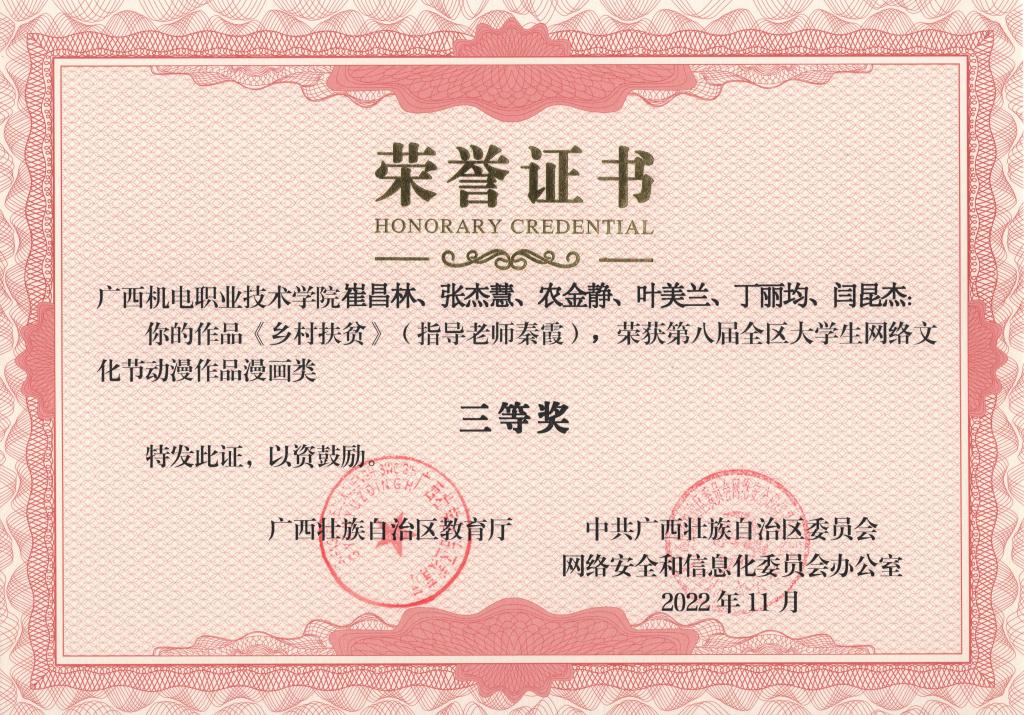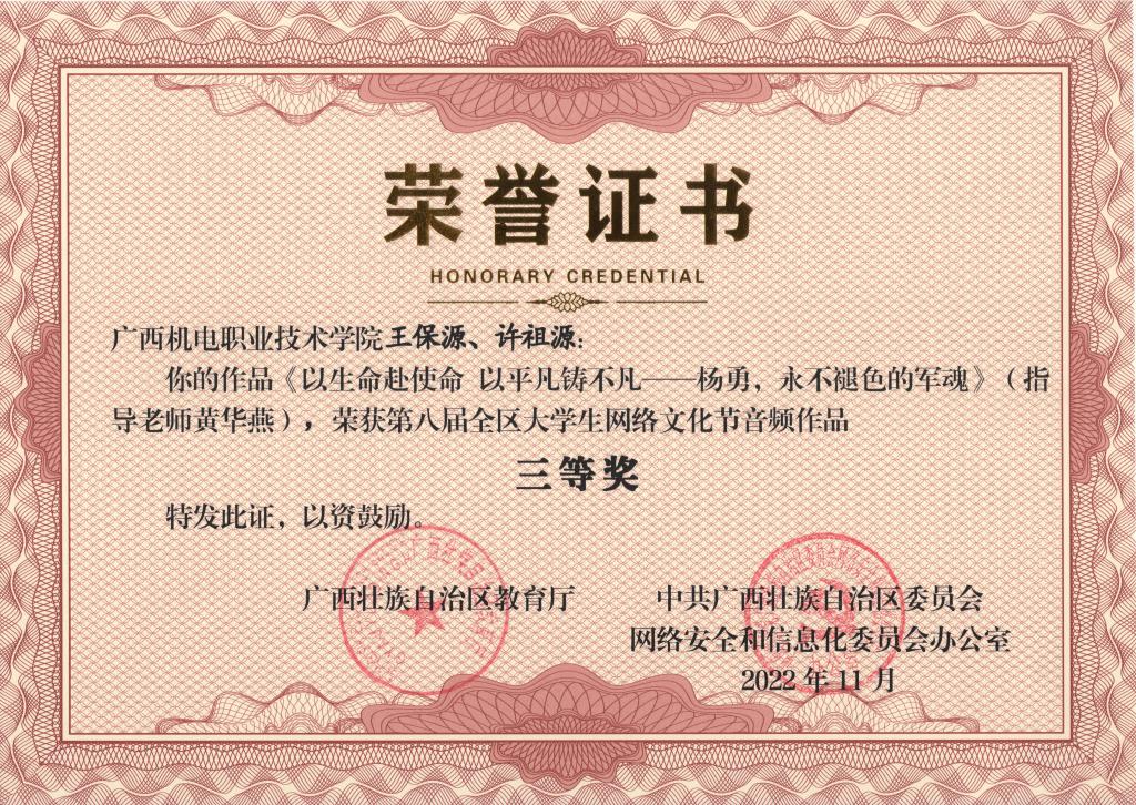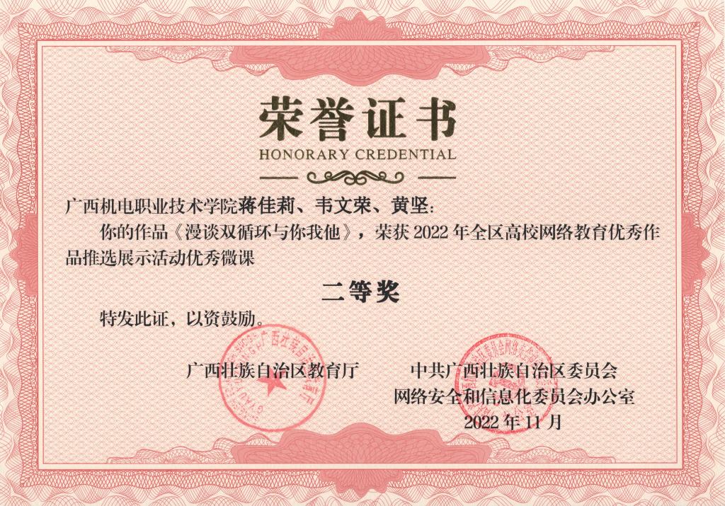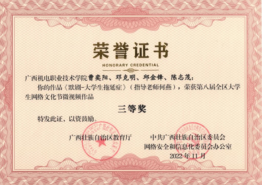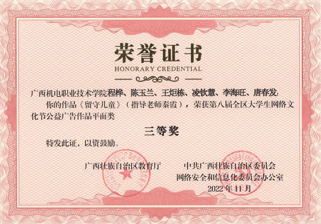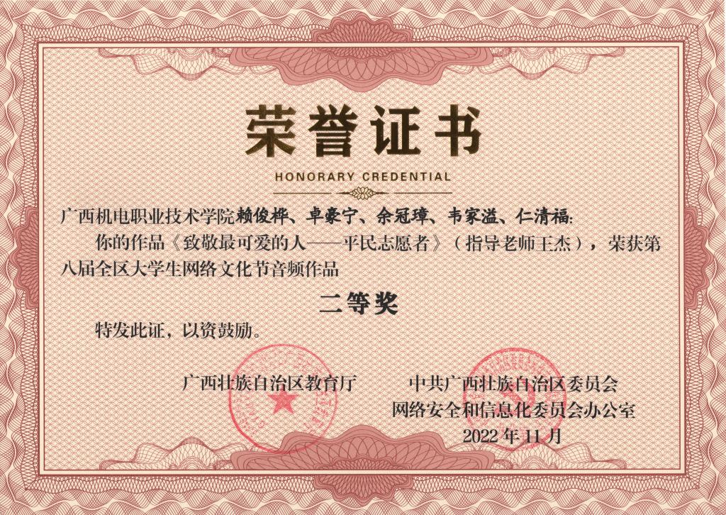 2022年11月,在第八届全区大学生网络文化节和2022年全区高校网络教育优秀作品推选展示活动中,学校荣获优秀组织奖,17项作品获奖。颁奖单位:广西壮族自治区教育厅、中共广西壮族自治区委员会网络安全和信息化委员会办公室。