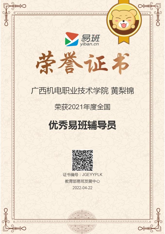 2022年4月,黄梨锦老师获评2021年度全国优秀易班辅导员,颁奖单位:教育部易班发展中心,