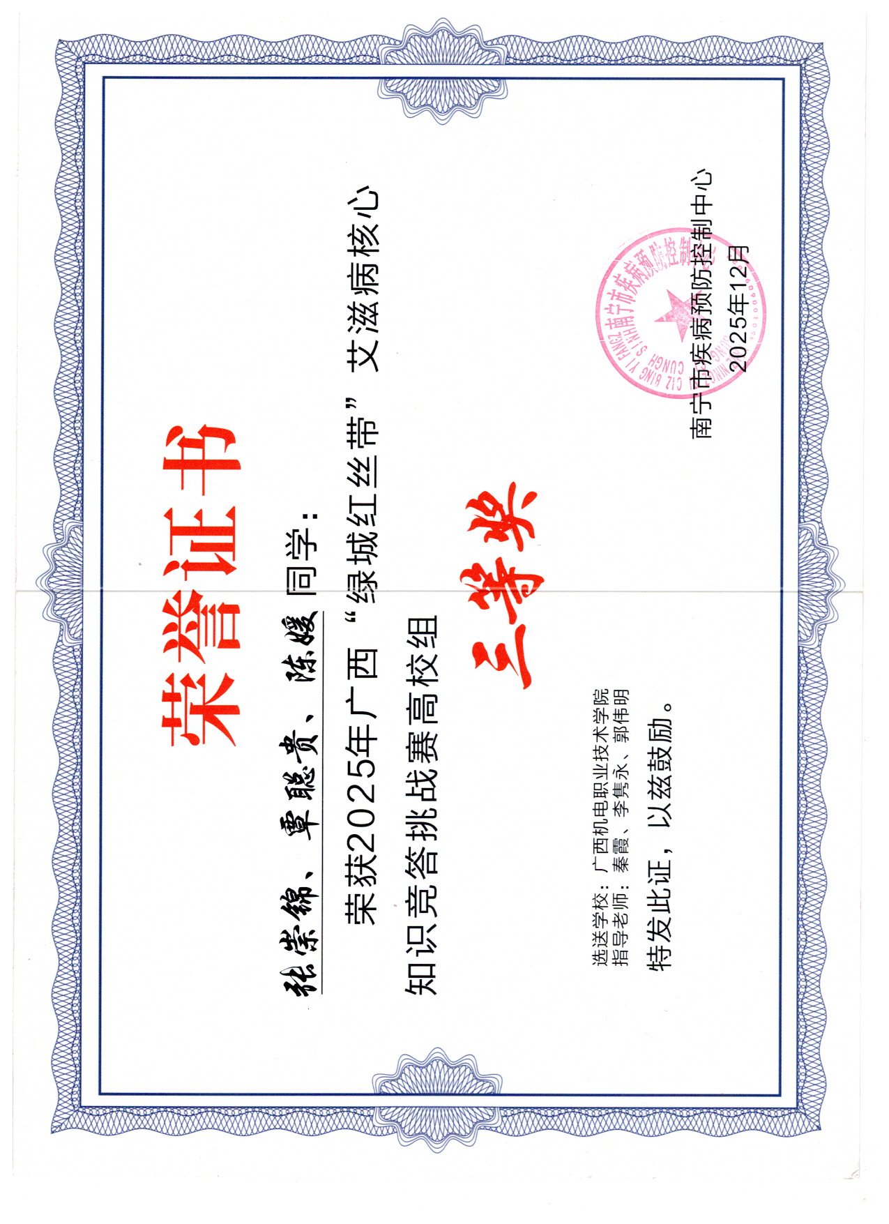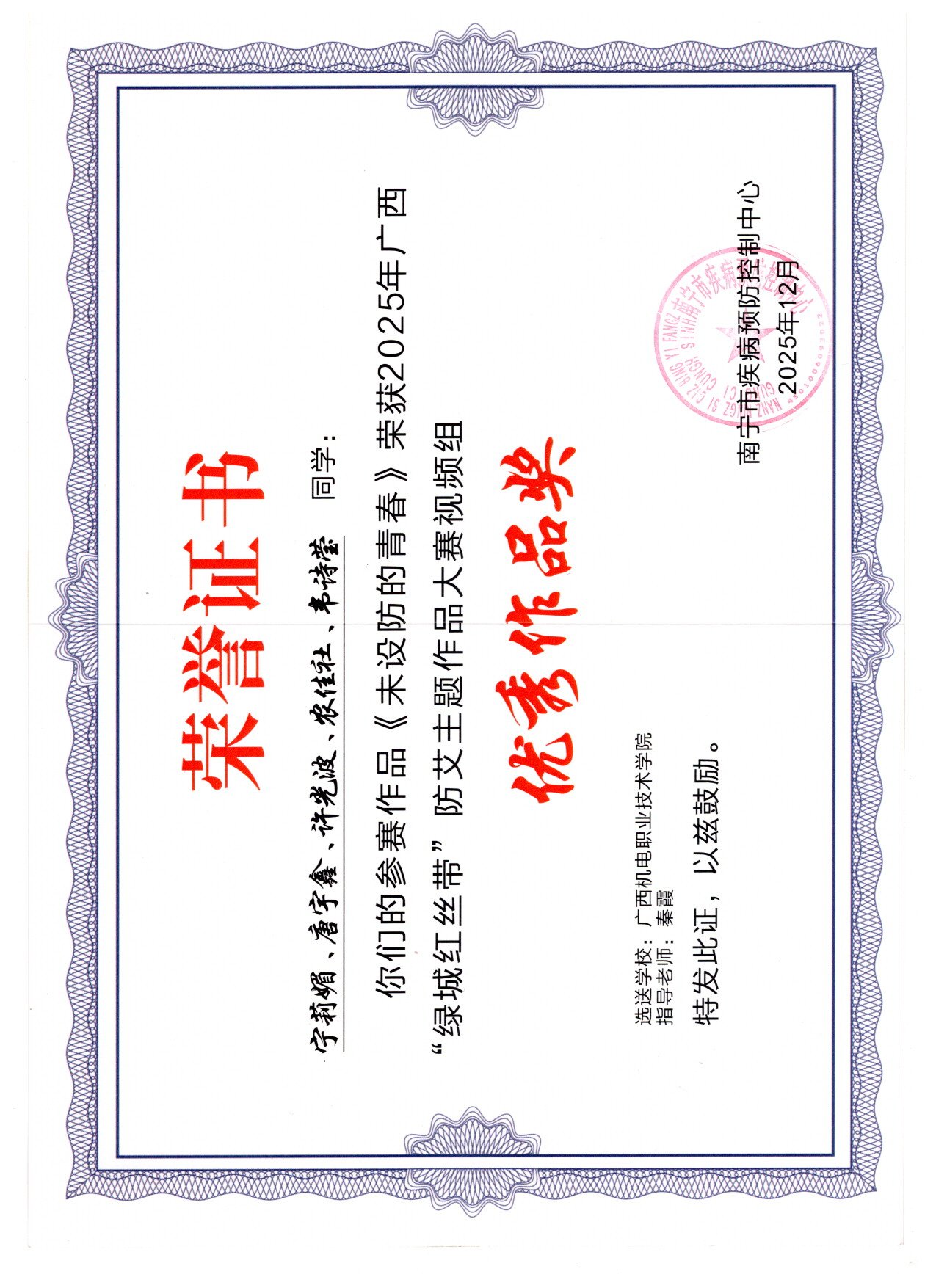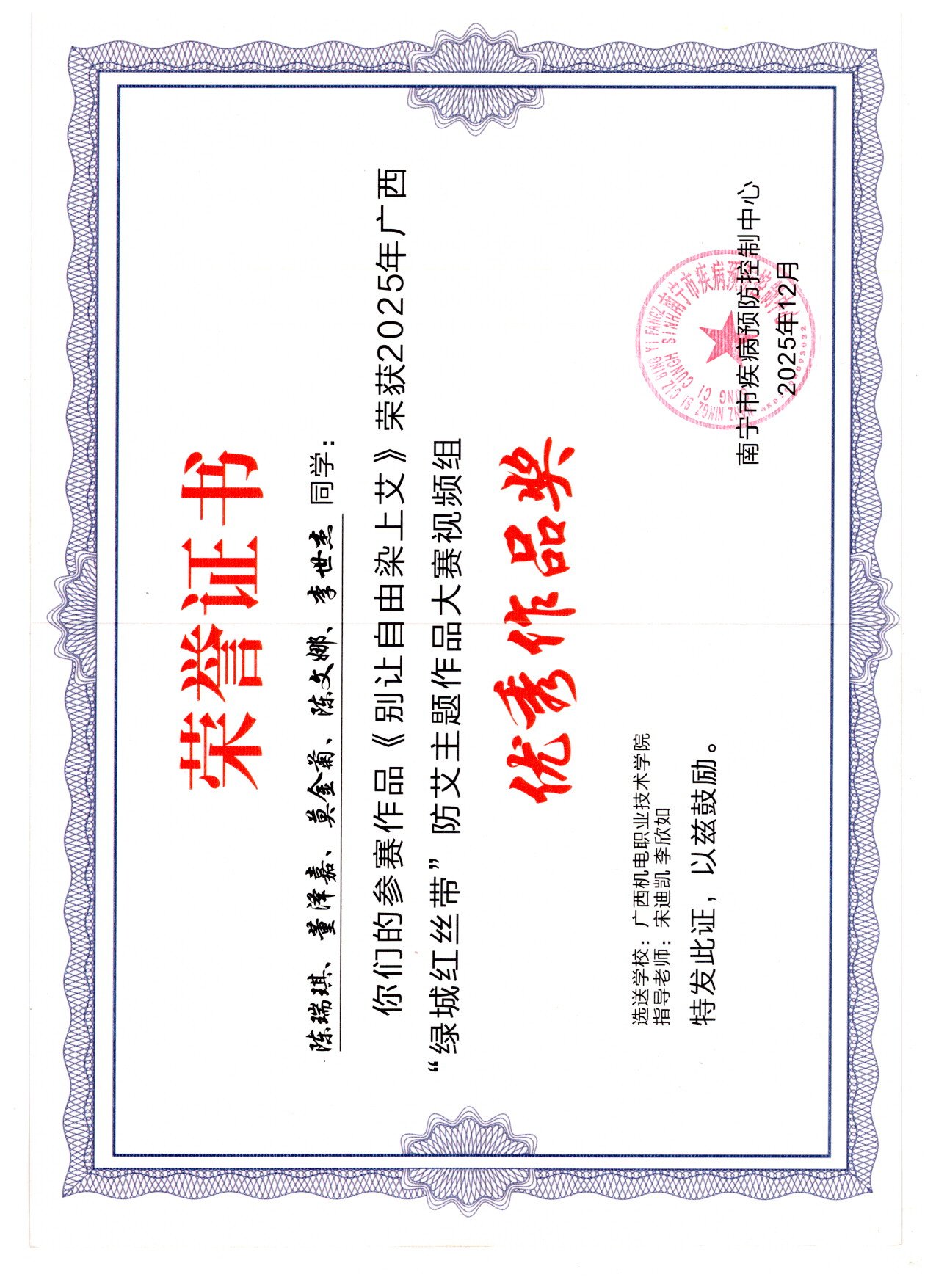 2025年12月,在广西“绿城红丝带”防艾主题大赛中,荣获视频组优秀作品奖2项、平面组优秀作品奖1项、知识竞赛挑战赛高校组三等奖1项。颁奖单位:南宁市疾病预防控制中心。