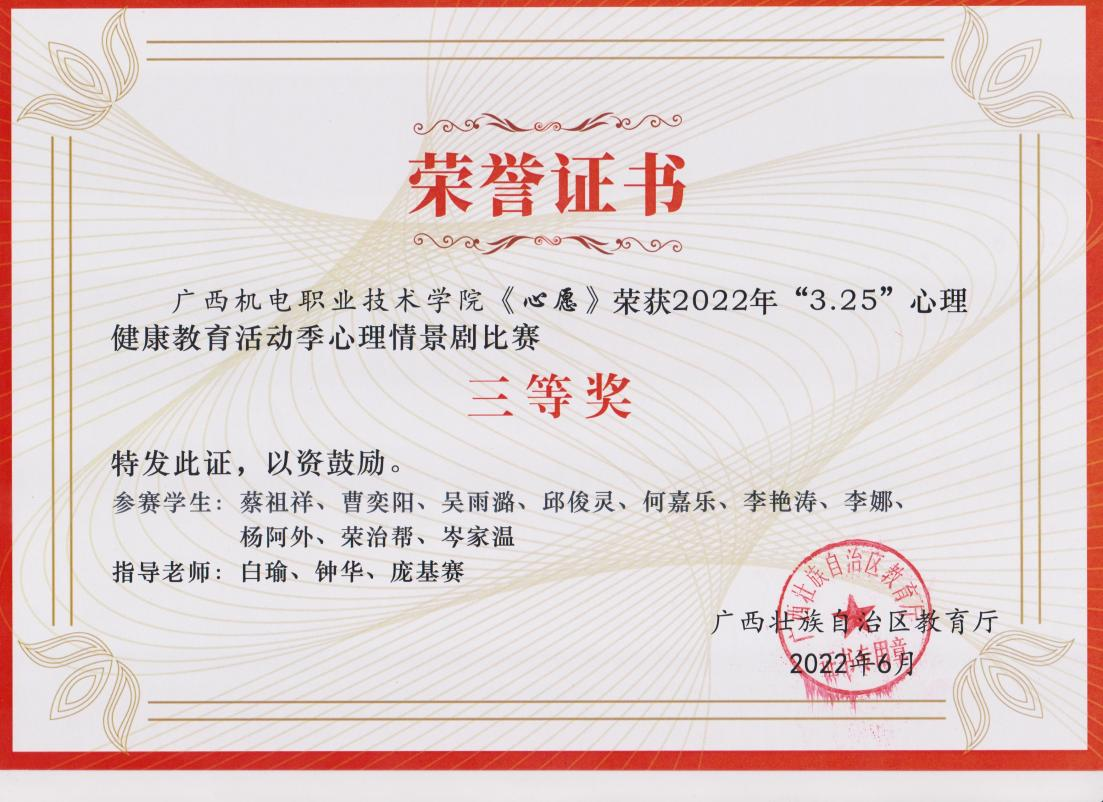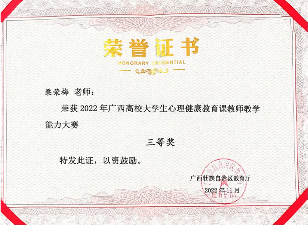 持续巩固课堂主渠道作用,不断加强心理健康教育教学建设。AC米兰心理健康专职教师在广西高校大学生心理健康教育课教师教学能力大赛中荣获三等奖,体现了教师在课程设计、教学实施方面的扎实功底与持续精进的专业姿态。