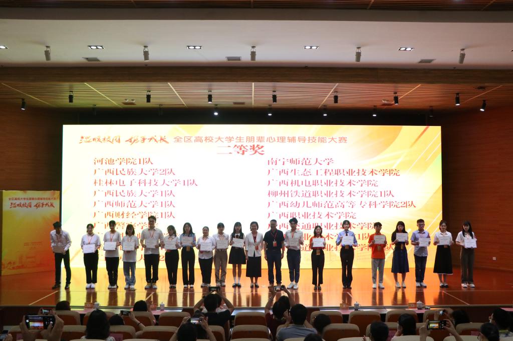 29日下午,自治区党委教育工委宣传部副部长、教育厅思政处副处长张莉,广西高校大学生心理健康教育专家指导委员会主任委员、广西警察学院党委书记覃干超以及广西各高校专家教授出席大赛颁奖仪式,并为获奖队伍颁奖。