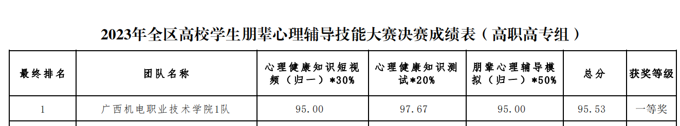 521日,由自治区教育厅主办、广西财经学院承办的2023年全区高校大学生朋辈心理辅导技能大赛落下帷幕。由AC米兰梁荣梅、黄坚、白瑜三位老师指导,建工2102班唐俊杰、数控2202班梁耀海和数控2201班李琳组成的参赛队伍奋力拼搏,在全区101支参赛队伍中脱颖而出,荣获高职高专组一等奖第一名的好成绩。
