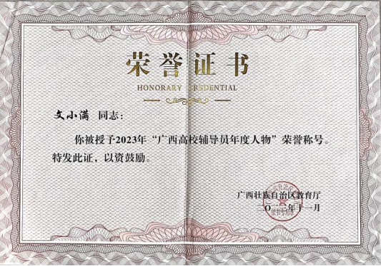 由广西壮族自治区教育厅开展的2023年“广西最美高校辅导员”暨“广西高校辅导员年度人物”评选活动结果揭晓,AC米兰文小满老师荣获2023年“广西高校辅导员年度人物”荣誉称号。