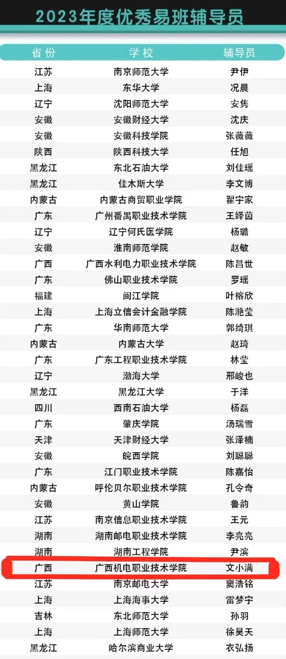 此次评选活动,教育部易班发展中心共征集到27个省(区、市)及新疆生产建设兵团383所高校共5个奖项895份评选材料。其中,申报优秀易班辅导员为153人。经组织专家对各省推荐的材料进行遴选,最终遴选出优秀易班辅导员77人。区内高校荣获全国优秀易班辅导员称号仅2位老师,文小满老师便是其一。