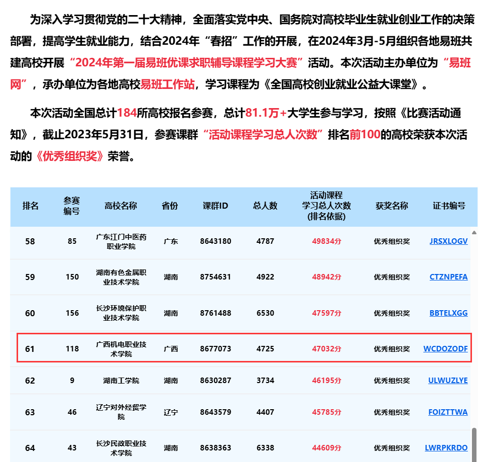 本次大赛旨在深入学习贯彻党的二十大精神,全面落实党中央、国务院对高校毕业生就业创业工作的决策部署,通过易班平台为广大学生提供优质的求职辅导课程,帮助他们提升就业能力,更好地适应市场需求。共有81.1万大学生参加,总计184所易班共建高校通过“易班优课”平台参与评选。AC米兰易班制作的 “2024年第一届易班优课求职辅导课程学习大赛”优课课群参与人数达到4725人,课群活跃指数达到6111,学习总人次为47032,学校最终荣获“优秀组织奖”。