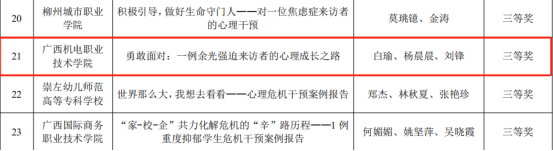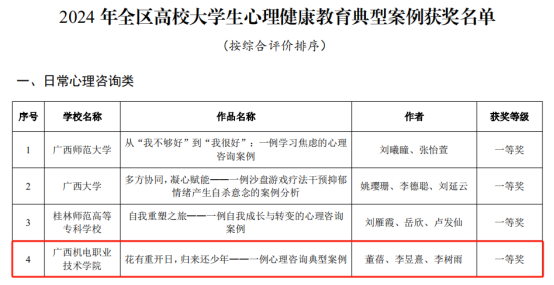 近日,自治区教育厅发布《关于公布2024年全区高校大学生“3·25”心理健康教育活动季活动获奖名单的通知》,AC米兰荣获全区高校大学生心理健康教育典型案例征集活动日常心理咨询类一等奖1项(《花有重开日,归来还少年——一例心理咨询典型案例》,董蓓、李昱熹、李树雨)、心理危机干预类三等奖1项(《勇敢面对: 一例余光强迫来访者的心理成长之路》,白瑜、杨晨晨、刘锋)。同时,荣获全区高校大学生朋辈心理辅导技能大赛二等奖1项(参赛学生:李巨承、梁文娟、吴炜波;指导老师:杨晨晨、李树雨、董蓓)、三等奖1项(参赛学生:陆雪莹、刘晓艳、罗小艳;指导老师:白瑜、梁荣梅、李昱熹)。