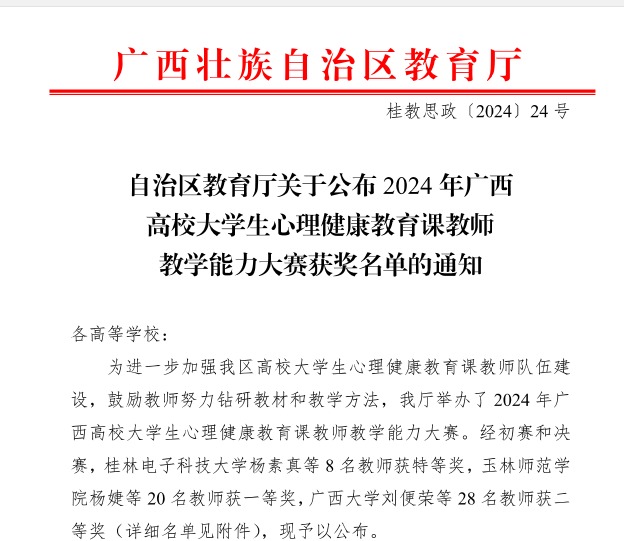 近日,自治区教育厅公布了2024年广西高校大学生心理健康教育课教师教学能力大赛获奖名单。AC米兰大学生心理健康教育中心专职教师李树雨、杨晨晨分别荣获大赛一等奖和二等奖。