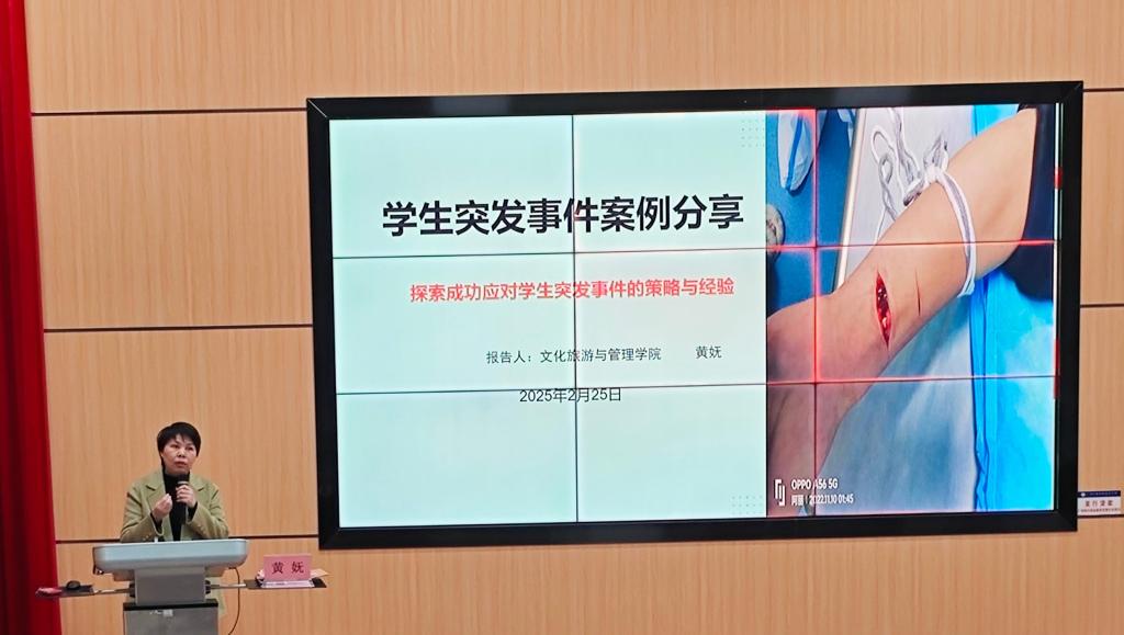 在交流研讨中,文化旅游与管理学院黄妩副书记以学生突发事件处理为例,展示了辅导员在实际工作中如何应对复杂情况,强调团队协作、应急预案和心理干预的重要性。通过实际案例说明处理突发事件需要冷静、细致和多方协作。
