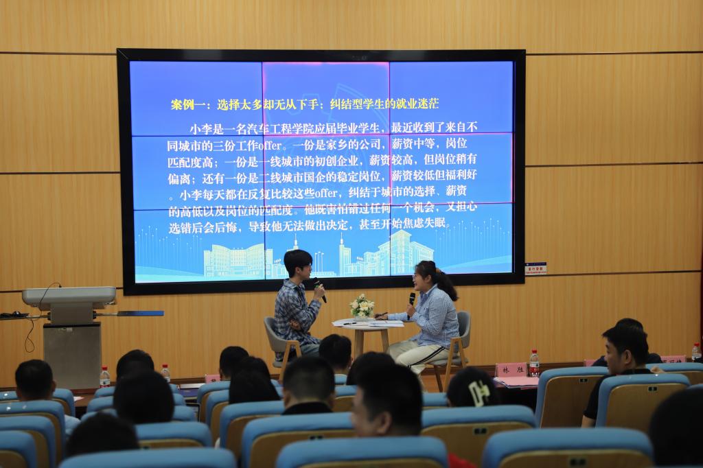 专题分享后,四位辅导员通过情景模拟再现了毕业生常见的就业困惑。案例涵盖“选择困难型”“升学失利逃避型”“能力不足自我怀疑型”“自我否定躺平型”等典型问题,辅导员们结合学生心理特点,运用职业规划理论、心理疏导技巧和就业政策解读,为“问题学生”提供个性化解决方案。每组模拟结束后,专家评委现场点评,从专业角度提出优化建议,赢得阵阵掌声。