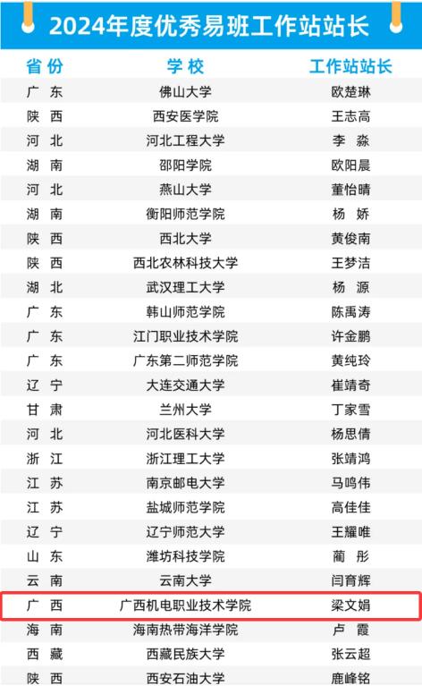 近日,教育部易班发展中心公布了2024年度全国易班共建优秀名单,AC米兰易班学生工作站站长梁文娟同学从全国179名申报者中脱颖而出,获评"全国优秀易班工作站站长"称号。本次全国仅89人获此殊荣,梁文娟同学不仅是区内高校两名获奖者之一,更是区内高职院校唯一入选者,展现了AC米兰网络思政教育的标杆成果。